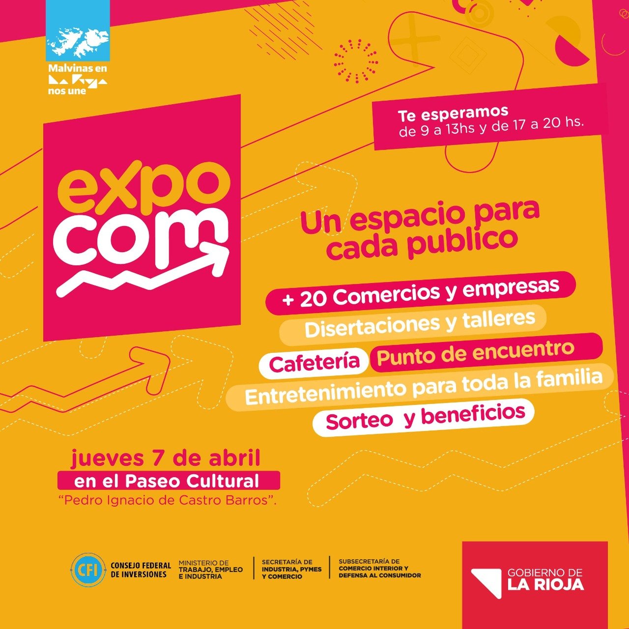 El Gobierno de La Rioja, a través de diferentes instituciones y organismos, llevará adelante la primera edición de la Expo Comercio (Expo Com) este jueves 7 de abril, de 9 a 13 y de 17 a 20.30, en el Paseo Cultural Castro Barros. En la jornada se presentará el programa provincial “INICIAR”, de fomento a nuevos comercios; además habrá talleres y disertaciones, sorteos y stands donde las empresas podrán exponer sus productos y servicios a la comunidad.