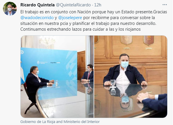 Así lo manifestó el Gobernador Ricardo Quintela en sus redes sociales, agradeciendo al Ministro del Interior, Wado de Pedro, y al Secretario del Interior de la Nación, Sergio Lepere, luego de mantener un encuentro en Buenos Aires para hablar de la situación y desarrollo de La Rioja.