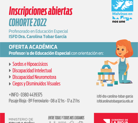 El ISFD «Dra. Carolina Tobar García» informa que se encuentra abierta la inscripción para la cohorte 2022, del Profesorado de Educación Especial con orientación en: