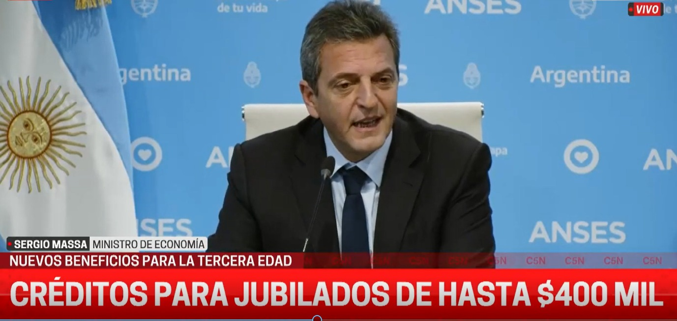 El ministro de Economía y precandidato presidencial de Unión por la Patria (UxP), Sergio Massa, y la directora ejecutiva de Anses, Fernanda Raverta, anunciaron este martes nuevos créditos de hasta $ 400.000 para jubilados y pensionados, con una Tasa Nominal Actual (TNA) del 29%, la más baja del mercado.