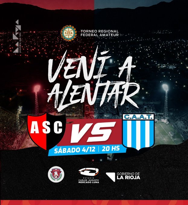 La Agencia de Espacios Públicos y Eventos te invita este sábado 4 desde las 20 hs. a disfrutar en familia del encuentro entre Andino y Tesorieri por el Torneo Regional Federal A Amateur en nuestro estadio Carlos Augusto Mercado Luna.