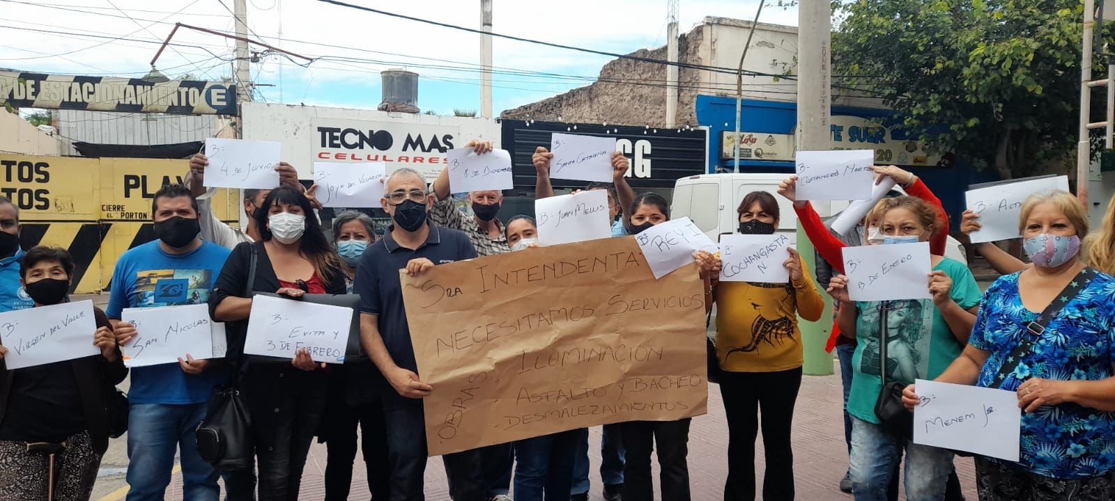 Presidentes de centros vecinales intentan ingresar al teatro para hacer escuchar sus reclamos. Allí se lleva a cabo el acto de apertura de sesiones ordinarias presidida por la Intendenta Ines Brizuela y Doria.