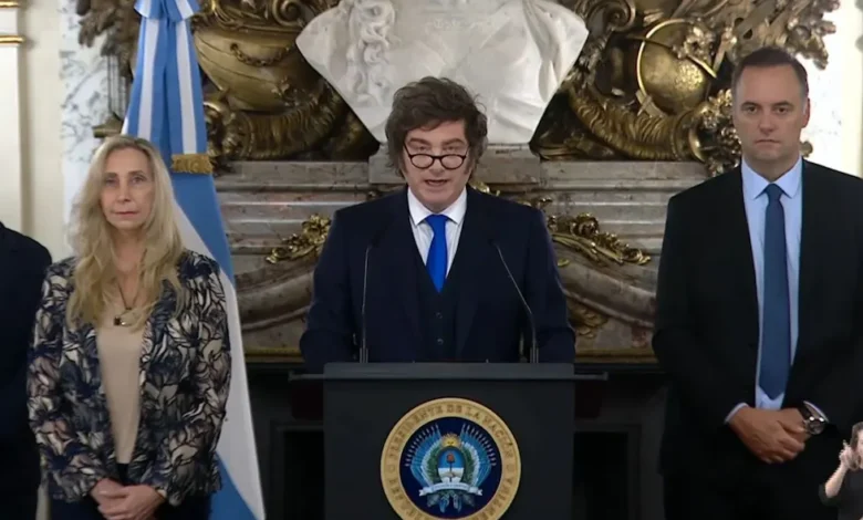 “Tengo el enorme honor, la inigualable alegría de dirigirme ante ustedes hoy”, introdujo Milei, “para informarles de un hecho de trascendencia histórica y sin precedentes para nuestro país”.