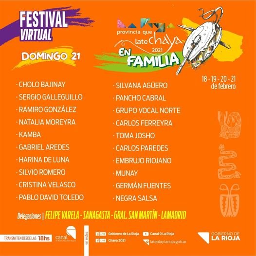 La pueden disfrutar a partir de las 18 por Canal 9, Radio Y Television Riojana, Facebook de Chaya 2021 y Late Play.