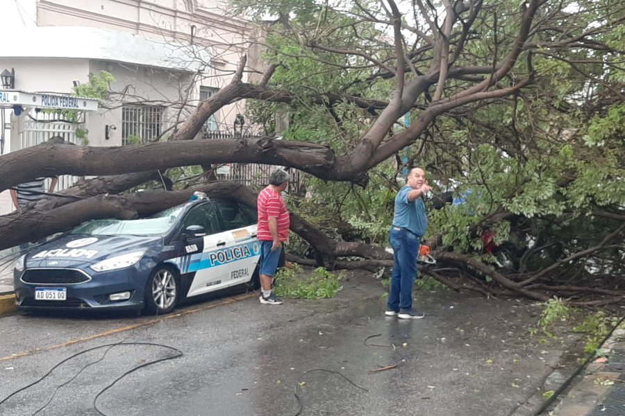 La torrencial lluvia que se registra en la Capital causó la caída de un árbol sobre calle San Nicolás de Bari, cayendo sobre un móvil de la Policía Federal, cuya sede se encuentra sobre el macrocentro de la ciudad. Una mujer que circulaba en moto por la zona habría sufrido lesiones.