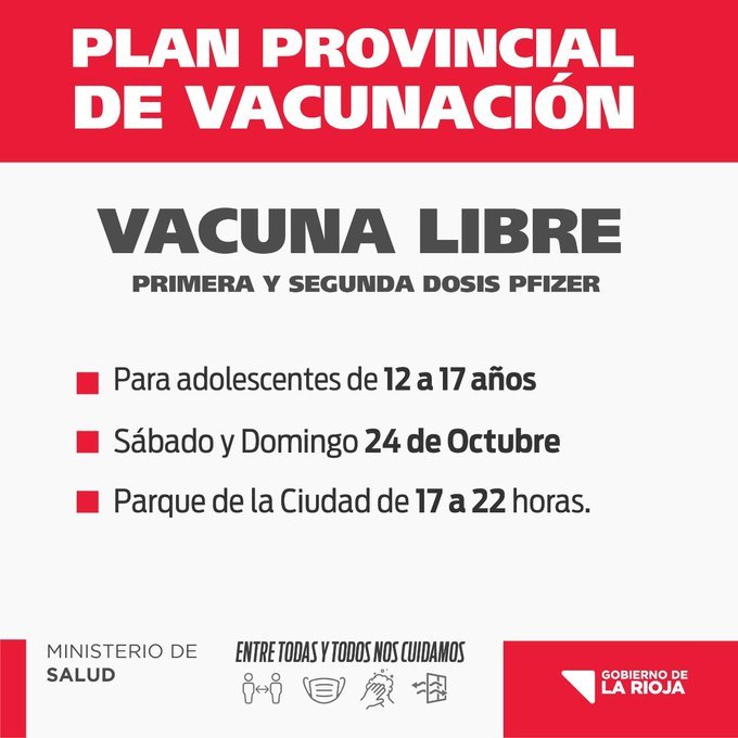 ¡¡VACUNACIÓN LIBRE PARA ADOLESCENTES DE 12 A 17 AÑOS!! Federico conteras 22 octubre, 2021 Si tenes entre 12 y 17 años, te invitamos a la jornada de vacunación libre en el Parque de la Ciudad COMPARTIR & PUBLICAR