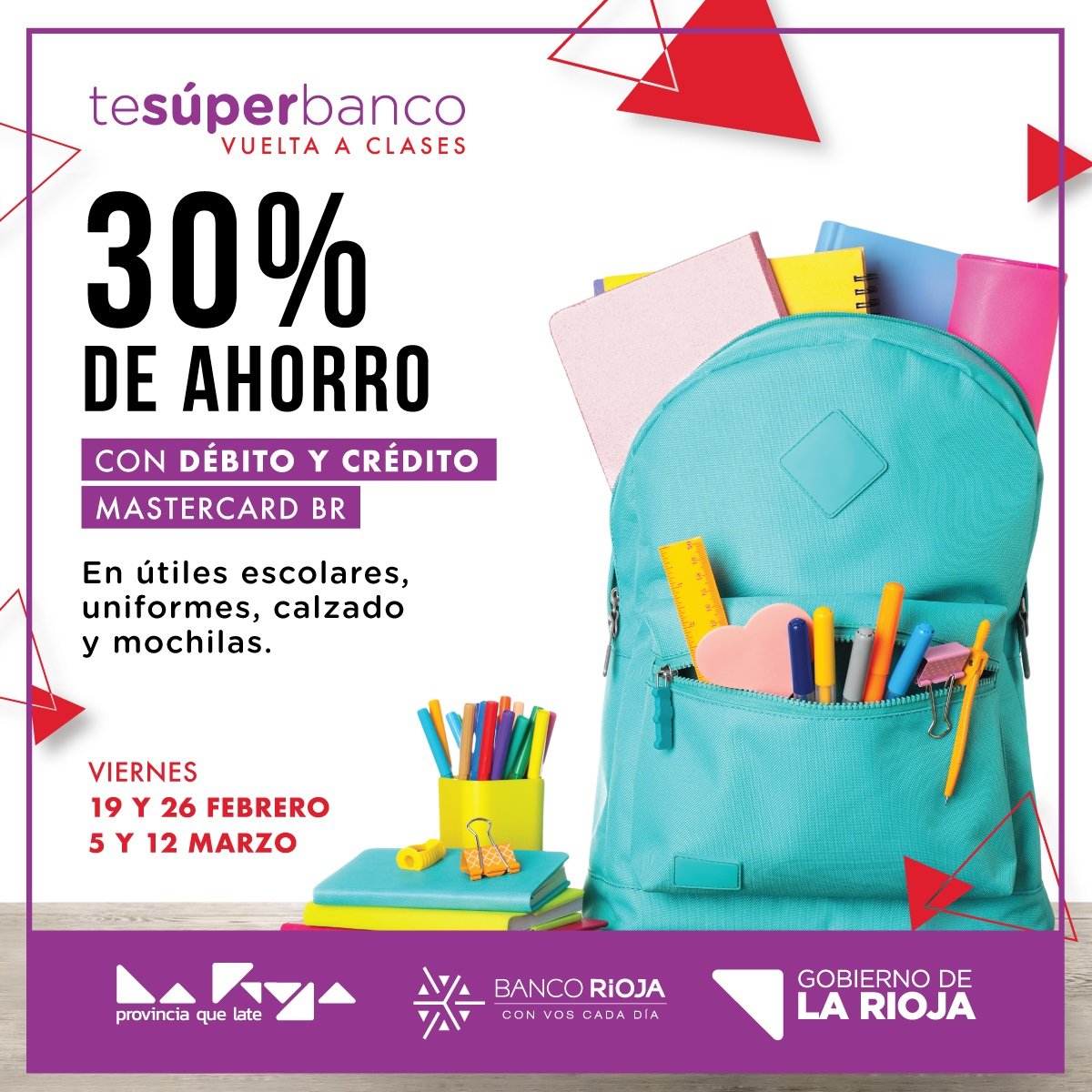 La promoción “Te súper banco Vuelta a Clases” incluye artículos de librería, uniformes, calzado y mochilas con un beneficio del 30% de ahorro en comercios adheridos de la Capital y del Interior pagando con tarjeta de débito y crédito Mastercard BR de la entidad los días 19 y 26 de febrero; y 5 y 12 de marzo.
